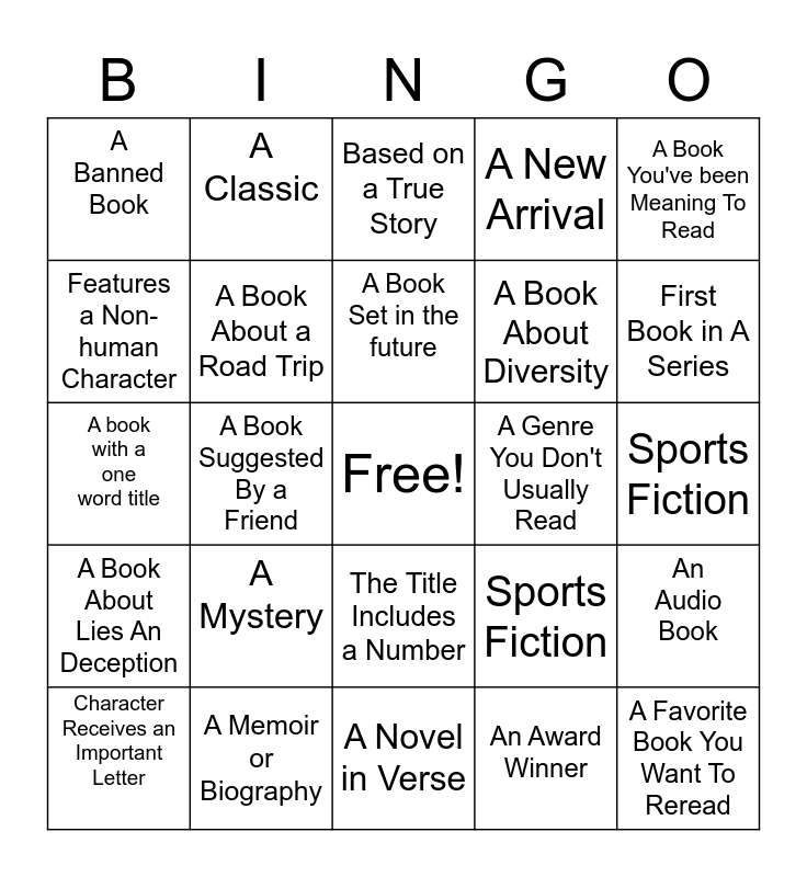 This bingo card has a free space and 24 words: Character Receives an Important Letter, A Mystery, A Book Set in the future, An Award Winner, A Book You've been Meaning To Read, A Banned Book, A Classic, Based on a True Story, A Genre You Don't Usually Read, Sports Fiction, A book with a one word title, A Book About a Road Trip, Sports Fiction, An Audio Book, Features a Non-human Character, A Memoir or Biography, A Novel in Verse, A New Arrival, First Book in A Series, A Book About Lies An Deception, A Book Suggested By a Friend, The Title Includes a Number, A Book About Diversity and A Favorite Book You Want To Reread.