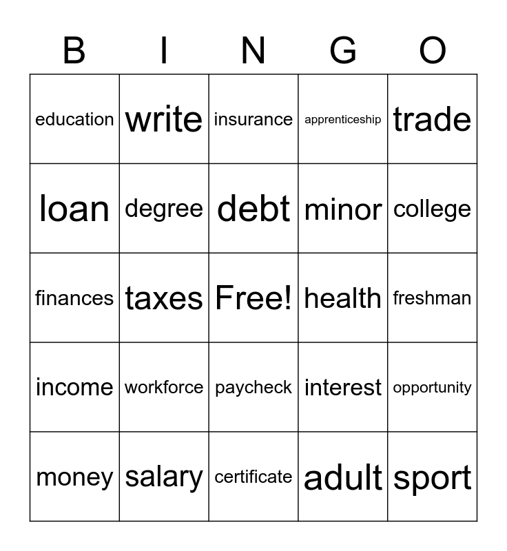 This bingo card has a free space and 42 words: graduate, debt, scholarship, workforce, adult, opportunity, sport, career, insurance, paycheck, freshman, college, taxes, trade, university, interest, rent, finances, application, write, loan, payment, pathway, education, automatic, major, minor, principal, budget, withdrawal, graduate, income, degree, certificate, emergency, money, salary, health, retire, internship, apprenticeship and success.