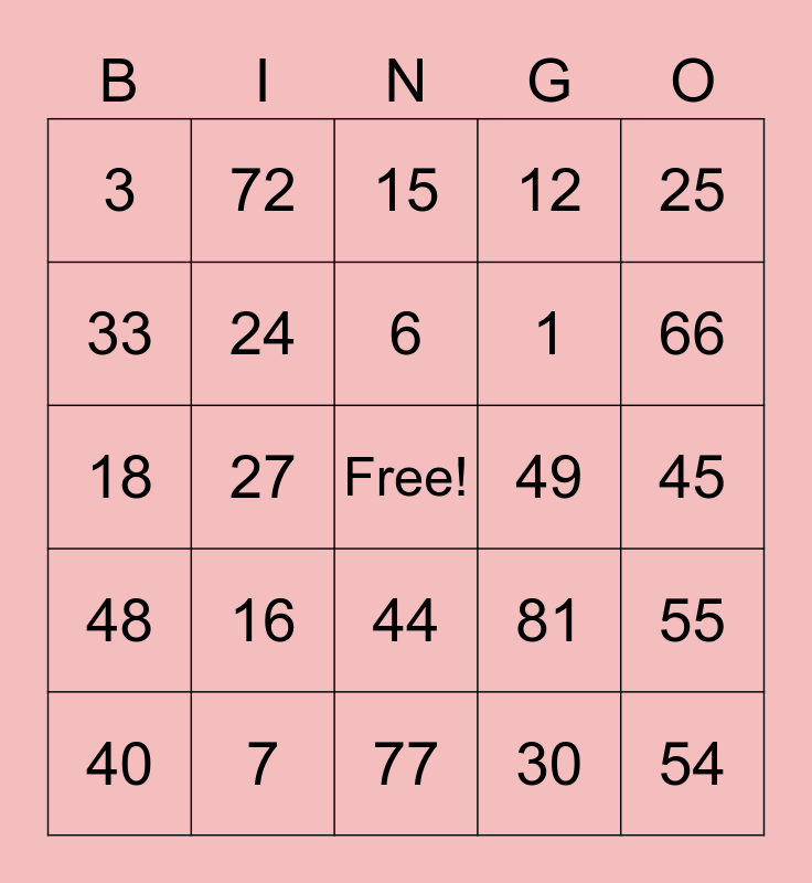 This bingo card has a free space and 24 words: 16, 7, 6, 40, 25, 3, 33, 72, 49, 44, 1, 18, 81, 55, 24, 30, 45, 15, 66, 27, 54, 48, 12 and 77.