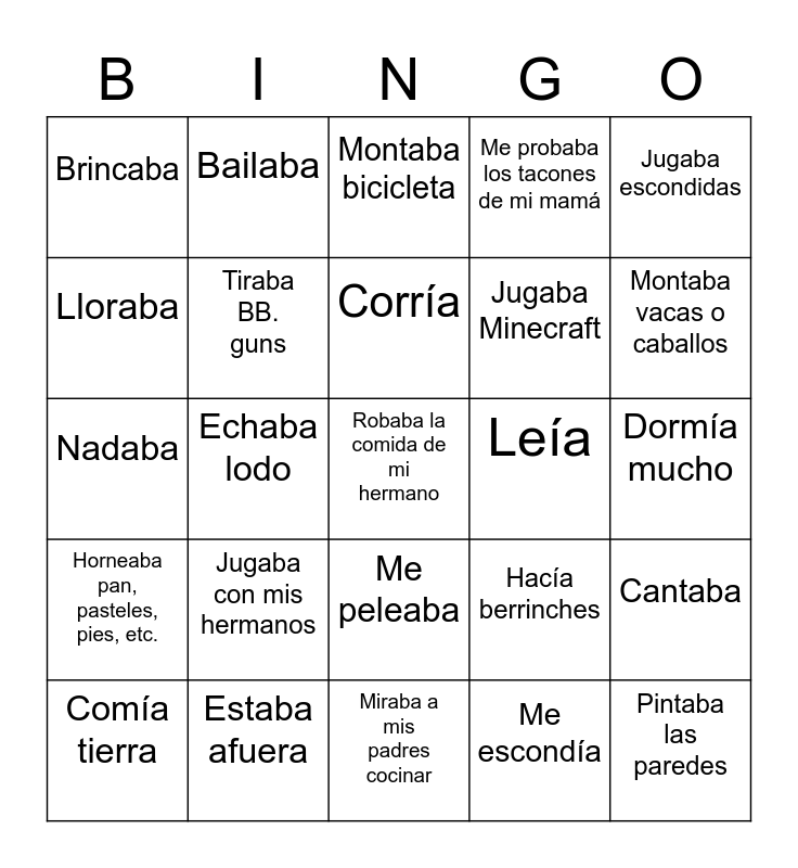 This bingo card has a free space and 24 words: Jugaba con mis hermanos, Estaba afuera, Corría, Comía tierra, Jugaba escondidas, Brincaba, Lloraba, Bailaba, Leía, Me peleaba, Jugaba Minecraft, Nadaba, Hacía berrinches, Cantaba, Tiraba BB. guns, Me escondía, Dormía mucho, Montaba bicicleta, Montaba vacas o caballos, Echaba lodo, Pintaba las paredes, Horneaba pan, pasteles, pies, etc., Me probaba los tacones de mi mamá and Miraba a mis padres cocinar.