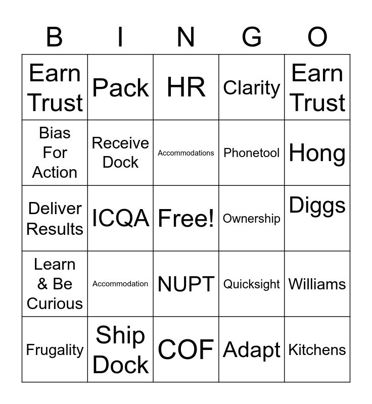 This bingo card has a free space and 33 words: Ownership, Pick, Accommodations, Exact, Diggs, Earn Trust, Receive Dock, COF, Phonetool, Kitchens, Bias For Action, Pack, Adapt, Moore, Deliver Results, ICQA, NUPT, Quicksight, Williams, Learn & Be Curious, Ship Dock, HR Cases, Clarity, Hong, PXT, Accommodation, HR, Ownership, Earn Trust, Frugality, Jeff B, DFW6 and Pick.