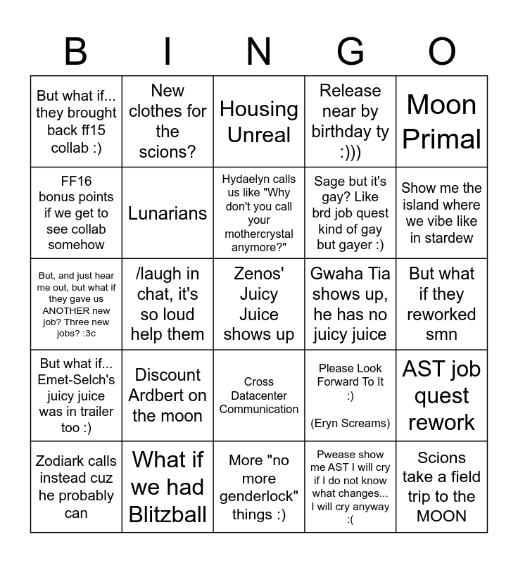 This bingo card has 25 words: Discount Ardbert on the moon, More "no more genderlock" things :), Hydaelyn calls us like "Why don't you call your mothercrystal anymore?", Zodiark calls instead cuz he probably can, Moon Primal, But what if... they brought back ff15 collab :), FF16 bonus points if we get to see collab somehow, New clothes for the scions?, Gwaha Tia shows up, he has no juicy juice, Cross Datacenter Communication, Sage but it's gay? Like brd job quest kind of gay but gayer :), But, and just hear me out, but what if they gave us ANOTHER new job? Three new jobs? :3c, Please Look Forward To It :) (Eryn Screams), AST job quest rework, Lunarians, Scions take a field trip to the MOON, But what if they reworked smn, Housing Unreal, Show me the island where we vibe like in stardew, /laugh in chat, it's so loud help them, Zenos' Juicy Juice shows up, What if we had Blitzball, But what if... Emet-Selch's juicy juice was in trailer too :), Release near by birthday ty :))) and Pwease show me AST I will cry if I do not know what changes... I will cry anyway :(.
