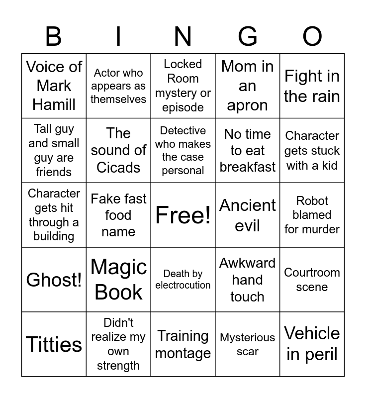 This bingo card has a free space and 24 words: Magic Book, Didn't realize my own strength, Detective who makes the case personal, Titties, Fight in the rain, Voice of Mark Hamill, Tall guy and small guy are friends, Actor who appears as themselves, Ancient evil, Death by electrocution, No time to eat breakfast, Character gets hit through a building, Awkward hand touch, Courtroom scene, The sound of Cicads, Mysterious scar, Robot blamed for murder, Locked Room mystery or episode, Character gets stuck with a kid, Fake fast food name, Vehicle in peril, Ghost!, Mom in an apron and Training montage.