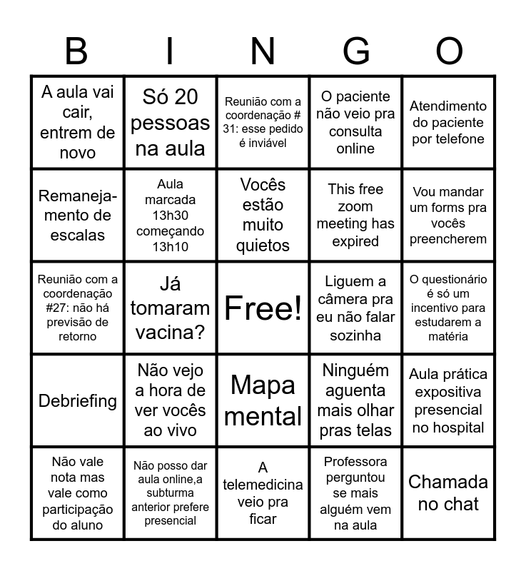 This bingo card has a free space and 49 words: Toda atividade faz parte da avaliação, Chamada no chat, Atividade prático-teórica, A telemedicina veio pra ficar, Não vejo a hora de ver vocês ao vivo, Animados para voltar?, Só 20 pessoas na aula, Não abram outras abas ou a prova vai travar, Remaneja-mento de escalas, Os pacientes estão aguardando, Aula marcada 13h30 começando 13h10, O paciente não veio pra consulta online, Aula prática expositiva presencial no hospital, Ninguém aguenta mais olhar pras telas, Fico mais concentrado ao vivo, Avisem aos colegas que venham pra aula, Vocês estão muito quietos, Liguem a câmera pra eu não falar sozinha, A outra turma falou bastante, Atendimento do paciente por telefone, Já tomaram vacina?, Professora perguntou se mais alguém vem na aula, A aula vai cair, entrem de novo, This free zoom meeting has expired, The host has another meeting in progress, Vou mandar um forms pra vocês preencherem, Não vale nota mas vale como participação do aluno, Não sei como colocar as notas no portal, Mapa mental, Debriefing, Flashcard, Feedback, PROF EU TENHO UMA DÚVIDA, PROFIIII, Não posso dar aula online,a subturma anterior prefere presencial, A aula está disponível no drive/portal por 5 dias, Seminário, Só estamos dando o básico que qualquer médico tem que saber pra sua profissão, O questionário é só um incentivo para estudarem a matéria, É difícil dar aula olhando pra tela preta, Abram as câmeras se puderem, a aula fica mais dinâmica, Pode mandar o portfólio individualmente?, Teleatendimento é tão bom quanto presencial, As provas vão ser presenciais sim, Reunião com a coordenação #27: não há previsão de retorno, Reunião com a coordenação # 31: esse pedido é inviável, Reunião com a coordenação #12: esse bimestre vai ser cobrada presença nas aulas, ''Minha boca calaras os segredos que me forem revelados’’ - Hipócrates and Parem com essa palhaçada no chat.