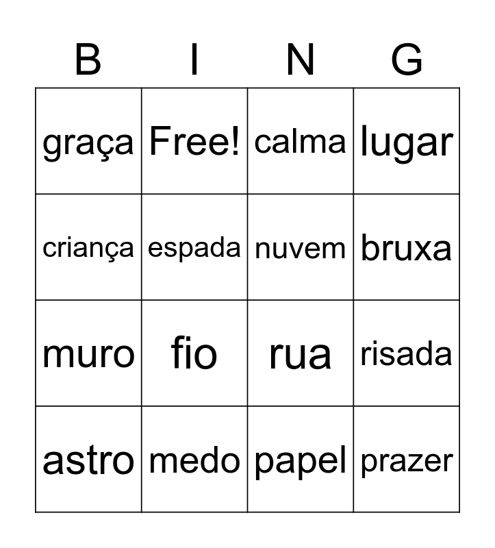 This bingo card has 1 images and 31 words: cadeira, fantasma, risada, amizade, prazer, nuvem, criança, super-herói, Free!, briga, bruxa, calma, beleza, saudade, medo, inteligência, rapaz, rua, sino, fogo, sala, menino, papel, animal, astro, lugar, muro, espada, graça, gota and fio.