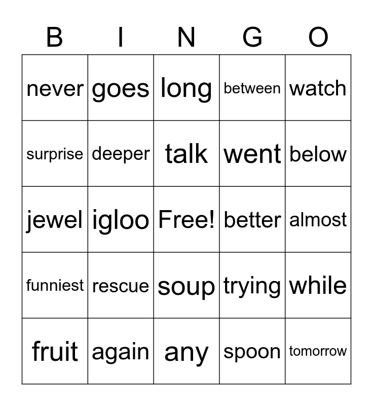 This bingo card has a free space and 32 words: spoon, broom, igloo, true, funniest, deeper, watch, while, goes, above, talk, long, far, something, better, full, fruit, jewel, soup, rescue, trying, scraped, almost, again, tomorrow, between, went, surprise, never, any, grow and below.
