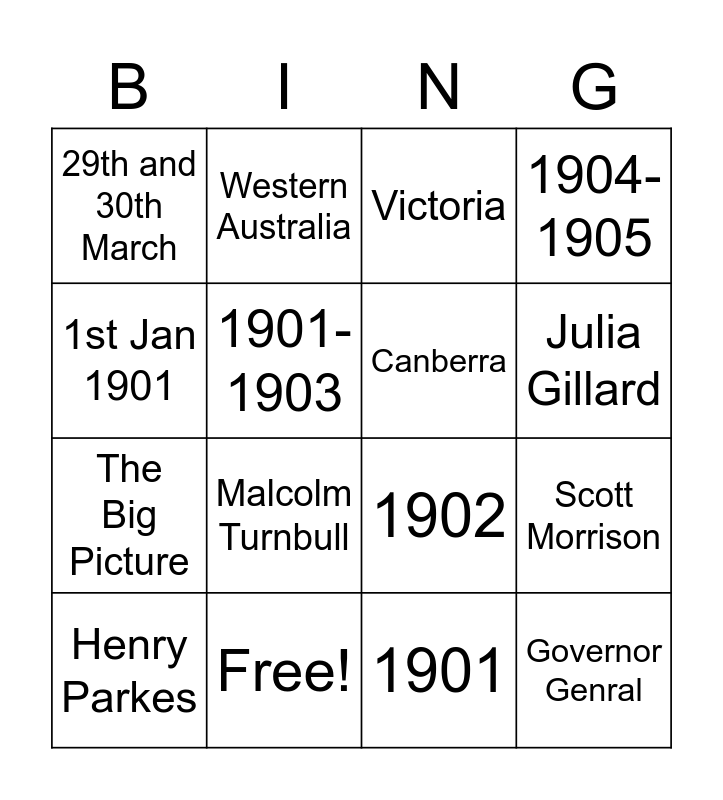 This bingo card has 16 words: Free!, Scott Morrison, Victoria, 29th and 30th March, The Big Picture, Western Australia, 1902, 1901, 1st Jan 1901, 1901-1903, Henry Parkes, 1904-1905, Malcolm Turnbull, Julia Gillard, Canberra and Governor Genral.