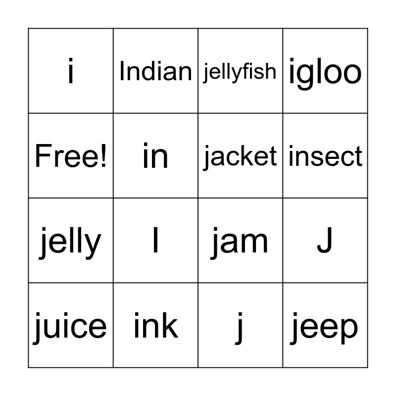 This bingo card has 16 words: ink, J, jellyfish, i, jelly, Indian, jam, j, Free!, in, juice, igloo, I, insect, jacket and jeep.