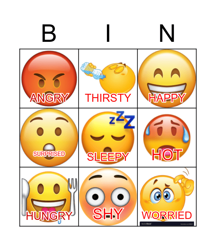This bingo card has 13 images and 13 words: COLD, SHY, WORRIED, SURPRISED, THIRSTY, HOT, HUNGRY, BORED, SCARED, ANGRY, SLEEPY, HAPPY and SAD.