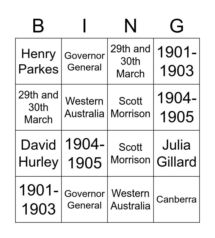 ⚠ This card has duplicate items: Malcolm Turnbull (2), Julia Gillard (2), Canberra (2), Henry Parkes (2), 29th and 30th March (2), Scott Morrison (2), 1902 (2), Governor General (2), David Hurley (2), Western Australia (2), 1901-1903 (2), The Big Picture (2), Victoria (2), 1904-1905 (2)
