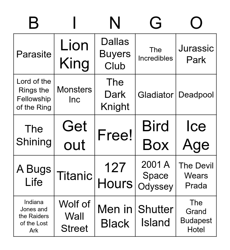 This bingo card has a free space and 30 words: Wolf of Wall Street, Truman Show, Get out, The Shawshank Redemption, Parasite, Dallas Buyers Club, Monsters Inc, 127 Hours, Bird Box, Men in Black, Ice Age, The Grand Budapest Hotel, Shutter Island, Casino Royale, Deadpool, Fight Club, 2001 A Space Odyssey, A Bugs Life, Titanic, Jurassic Park, The Shining, Black Panther, Lion King, Gladiator, Lord of the Rings the Fellowship of the Ring, The Incredibles, The Devil Wears Prada, Indiana Jones and the Raiders of the Lost Ark, The Dark Knight and Toy Story.