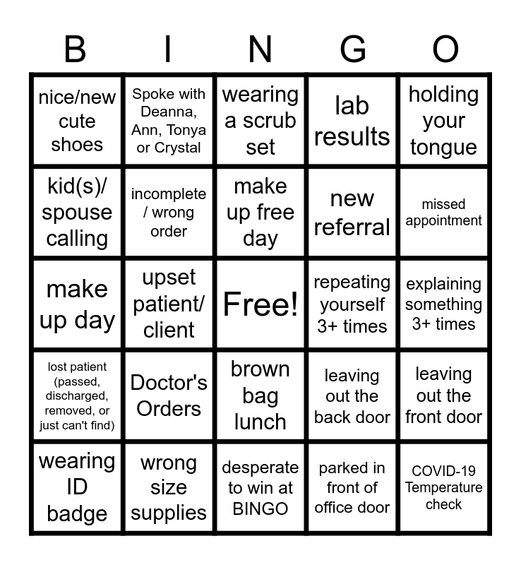 This bingo card has a free space and 24 words: Doctor's Orders, wrong size supplies, make up free day, wearing ID badge, holding your tongue, nice/new cute shoes, kid(s)/ spouse calling, Spoke with Deanna, Ann, Tonya or Crystal, repeating yourself 3+ times, brown bag lunch, new referral, make up day, leaving out the back door, leaving out the front door, incomplete / wrong order, parked in front of office door, explaining something 3+ times, wearing a scrub set, missed appointment, upset patient/ client, COVID-19 Temperature check, lost patient (passed, discharged, removed, or just can't find), lab results and desperate to win at BINGO.