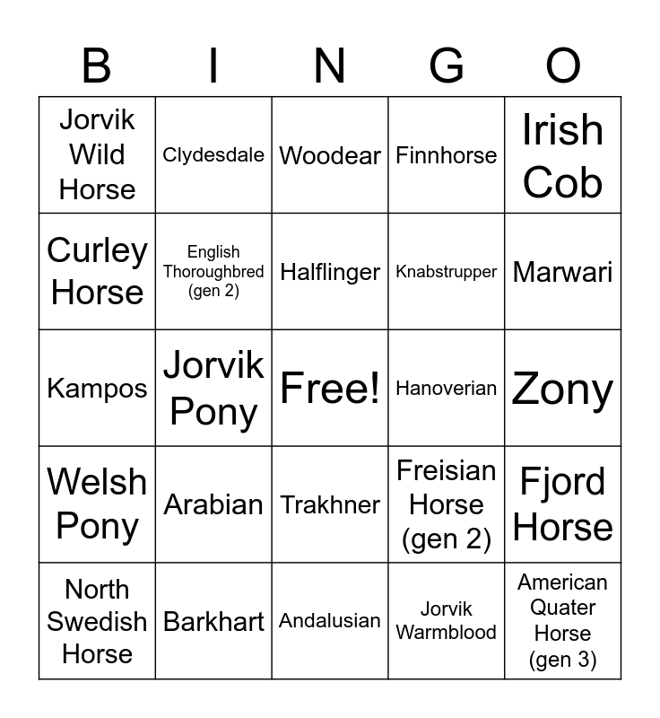 This bingo card has a free space and 48 words: Akhal teke, American Quater Horse (gen 3), American Quater Horse (gen 2), Andalusian, Arabian, Chincoteague Pony, Clydesdale, Connemara, Curley Horse, English Thoroughbred (gen 3), English Thoroughbred (gen 2), Finnhorse, Fjord Horse, Freisian Horse (gen 2), Jorvik Friesian, Gotland Pony, Halflinger, Hanoverian, Icelandic, Irish Cob, Jorvik Pony, Jorvik Warmblood, Jorvik Wild Horse, Knabstrupper, Lusitano, Marwari, North Swedish Horse, Shire, Trakhner, Welsh Pony, Rune Runner, Umbra, Ayla, Fawncy, Barkhart, Tellina, Heidrun, Zony, Vega, Tombhoof, Petra, Solas, Woodear, Dorcha, Kampos, Brinicle, Pepita and Eryins.