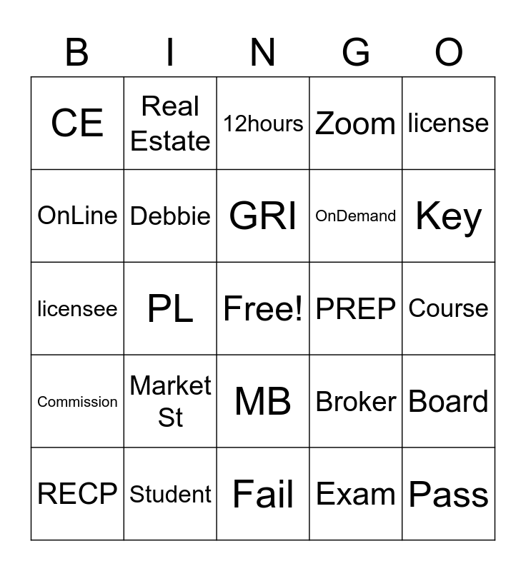 This bingo card has a free space and 29 words: RECP, IAR, PL, Post, CE, 12hours, Debbie, Market St, PREP, Student, Course, Pass, Fail, Exam, Key, Approved, MB, Commission, license, licensee, Broker, Instructor, OnDemand, OnLine, Zoom, Real Estate, Board, GRI and REALTOR.