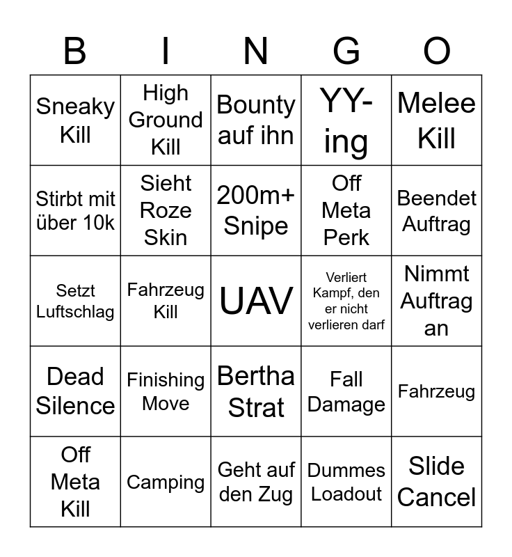 This bingo card has a free space and 24 words: Finishing Move, Camping, 200m+ Snipe, Off Meta Kill, Melee Kill, Sneaky Kill, Stirbt mit über 10k, High Ground Kill, Verliert Kampf, den er nicht verlieren darf, Bertha Strat, Off Meta Perk, Setzt Luftschlag, Fall Damage, Fahrzeug, Sieht Roze Skin, Dummes Loadout, Nimmt Auftrag an, Bounty auf ihn, Beendet Auftrag, Fahrzeug Kill, Slide Cancel, Dead Silence, YY-ing and Geht auf den Zug.