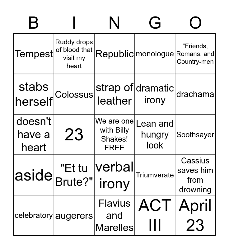This bingo card has a free space and 24 words: "Et tu Brute?", augerers, strap of leather, celebratory, "Friends, Romans, and Country-men, Tempest, stabs herself, Ruddy drops of blood that visit my heart, Lean and hungry look, verbal irony, dramatic irony, doesn't have a heart, Triumverate, Cassius saves him from drowning, Colossus, ACT III, Soothsayer, Republic, drachama, 23, April 23, aside, monologue and Flavius and Marelles.