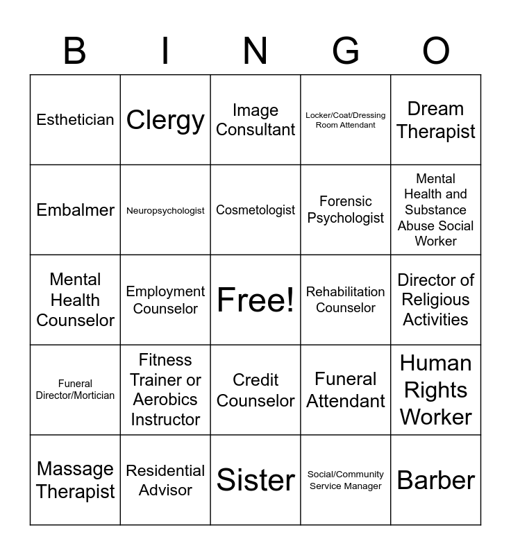 This bingo card has a free space and 68 words: Adoption Counselor, Barber, Behavioral Analyst, Bereavement Counselor, Child Psychologist, Childcare Worker, Clergy, Clinical Psychologist, Cosmetologist, Counseling Psychologist, Credit Counselor, Developmental Service Worker, Director of Religious Activities, Dream Therapist, Eating Disorder Counselor, Embalmer, Employment Counselor, Esthetician, Ethicist, Fitness Trainer or Aerobics Instructor, Forensic Psychologist, Funeral Attendant, Funeral Director/Mortician, Funeral Service Manager, Gerontologist, Hairdresser/Cosmetologist, Health Education Specialist, Healthcare Social Worker, Human Rights Worker, Hypnotist, Image Consultant, Industrial-Organizational Psychologist, Laundry/Dry Cleaning Worker, Loan Counselor, Locker/Coat/Dressing Room Attendant, Manicurist/Pedicurist, Marriage and Family Therapist, Massage Therapist, Mental Health and Substance Abuse Social Worker, Mental Health Counselor, Missionary, Nanny, Neuropsychologist, Personal and Home Care Aide, Personal Service Workers Supervisor, Psychologist, Psychometrist, Rabbi, Rehabilitation Counselor, Residential Advisor, School Psychologist, Self-Improvement Coach, Shampooer, Sister, Skincare Specialist, Social Worker, Social/Community Service Manager, Social/Human Service Assistant, Spa Manager, Sport Psychologist, Substance Abuse and Behavioral Disorder Counselor, Tailor/Dressmaker, Tattoo and Body Artist, Textile/Garment Presser, Tribal Leader, Victim Advocate, Volunteer Coordinator and Wigmaker.