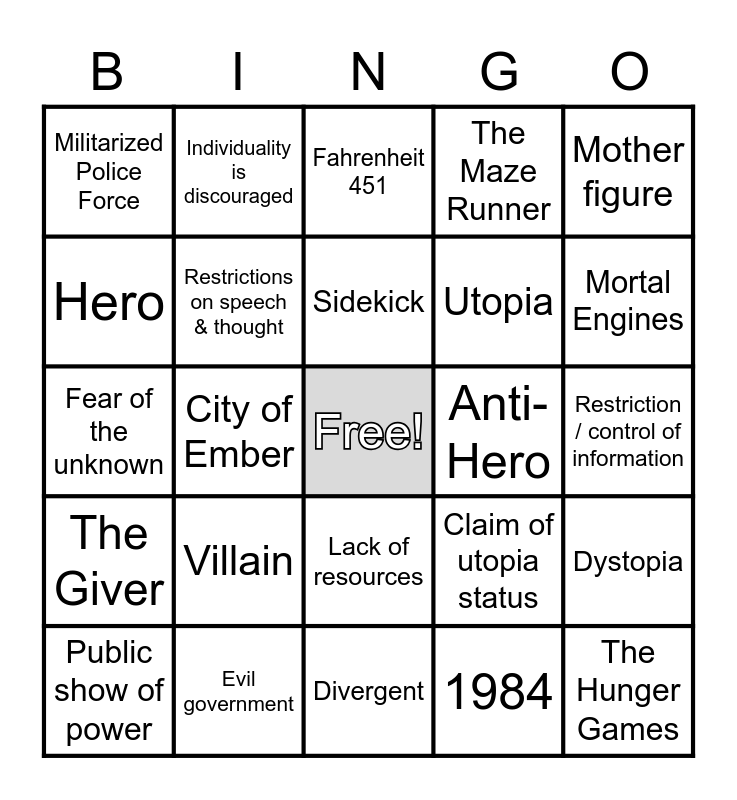 This bingo card has a free space and 24 words: Villain, Evil government, Sidekick, Public show of power, Mother figure, Militarized Police Force, Hero, Individuality is discouraged, Anti-Hero, Lack of resources, Utopia, Fear of the unknown, Claim of utopia status, Dystopia, Restrictions on speech & thought, 1984, Restriction / control of information, Fahrenheit 451, Mortal Engines, City of Ember, The Hunger Games, The Giver, The Maze Runner and Divergent.