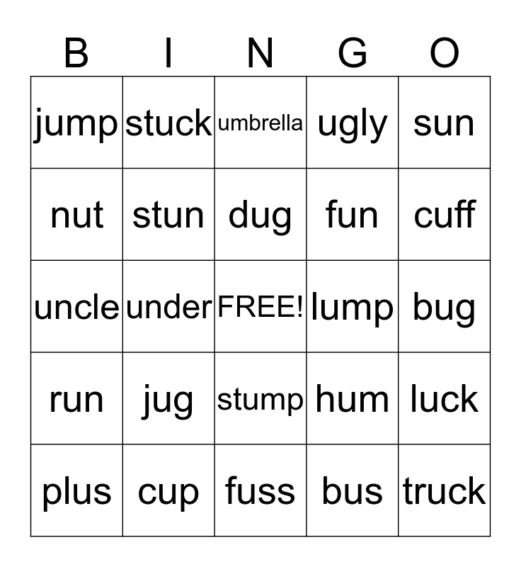 This bingo card has a free space and 24 words: jug, cup, dug, plus, sun, jump, nut, stuck, lump, stump, fun, uncle, hum, luck, stun, bus, bug, umbrella, cuff, under, truck, run, ugly and fuss.