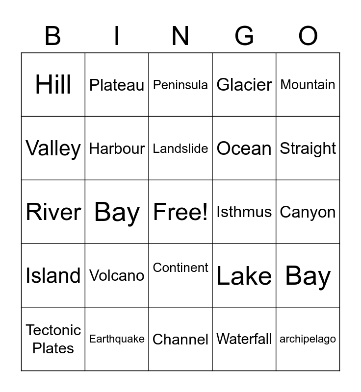 This bingo card has a free space and 24 words: Volcano, Earthquake, Landslide, Tectonic Plates, Mountain, Hill, Valley, Plateau, Isthmus, Continent, Ocean, River, Lake, Bay, Harbour, Waterfall, Canyon, Peninsula, Straight, Bay, archipelago, Island, Glacier and Channel.
