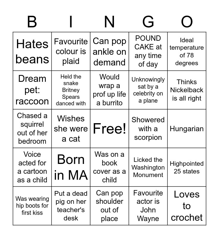 This bingo card has a free space and 24 words: Born in MA, Put a dead pig on her teacher's desk, Would wrap a prof up life a burrito, Was wearing hip boots for first kiss, Ideal temperature of 78 degrees, Hates beans, Dream pet: raccoon, Favourite colour is plaid, Showered with a scorpion, Was on a book cover as a child, Unknowingly sat by a celebrity on a plane, Chased a squirrel out of her bedroom, Licked the Washington Monument, Highpointed 25 states, Held the snake Britney Spears danced with, Favourite actor is John Wayne, Hungarian, Can pop ankle on demand, Thinks Nickelback is all right, Wishes she were a cat, Loves to crochet, Voice acted for a cartoon as a child, POUND CAKE at any time of day and Can pop shoulder out of place.