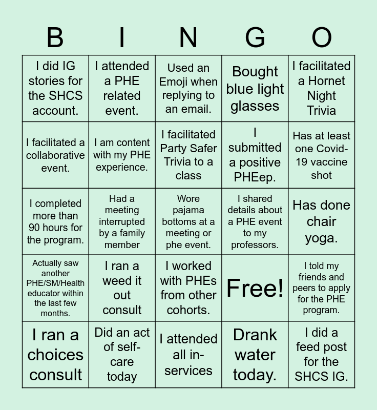 This bingo card has 25 words: I ran a weed it out consult, I attended all in-services, I facilitated Party Safer Trivia to a class, I ran a choices consult, I facilitated a Hornet Night Trivia, I did IG stories for the SHCS account., I facilitated a collaborative event., I attended a PHE related event., I shared details about a PHE event to my professors., I worked with PHEs from other cohorts., I submitted a positive PHEep., I completed more than 90 hours for the program., Free!, I told my friends and peers to apply for the PHE program., I am content with my PHE experience., I did a feed post for the SHCS IG., Has done chair yoga., Used an Emoji when replying to an email., Has at least one Covid-19 vaccine shot, Had a meeting interrupted by a family member, Wore pajama bottoms at a meeting or phe event., Did an act of self-care today, Actually saw another PHE/SM/Health educator within the last few months., Bought blue light glasses and Drank water today..