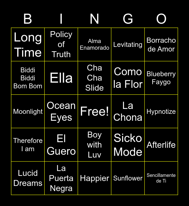 This bingo card has a free space and 29 words: Lucid Dreams, Dynamite, Ocean Eyes, Seven Nation Army, Long Time, Alma Enamorado, Ella, El Guero, La Chona, La Puerta Negra, Hypnotize, Sencillamente de Ti, Happier, Sunflower, Blueberry Faygo, Dios Incomparable, Boy with Luv, Therefore I am, Borracho de Amor, Moonlight, Sicko Mode, Better Now, Como la Flor, Biddi Biddi Bom Bom, Levitating, Policy of Truth, Afterlife, Cha Cha Slide and Increible.