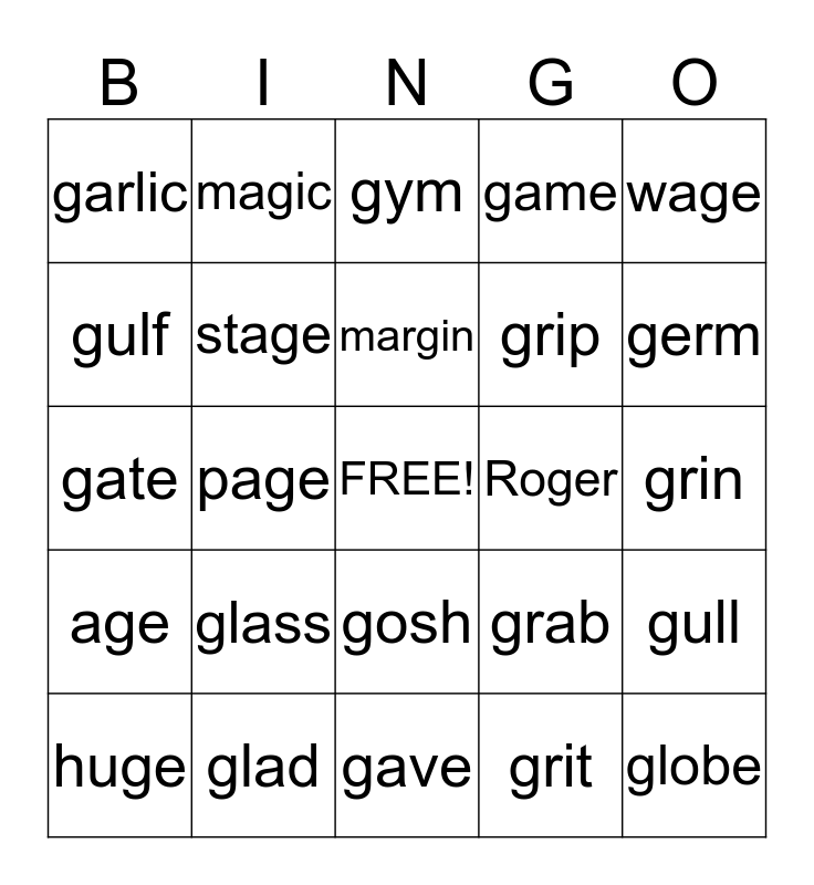 This bingo card has a free space and 33 words: gem, rage, page, cage, age, stage, wage, huge, magic, congest, margin, gym, ginger, gentle, Roger, germ, glad, gate, glass, grab, gosh, grill, garlic, grin, gave, globe, game, grip, gulf, gull, gust, grit and glide.