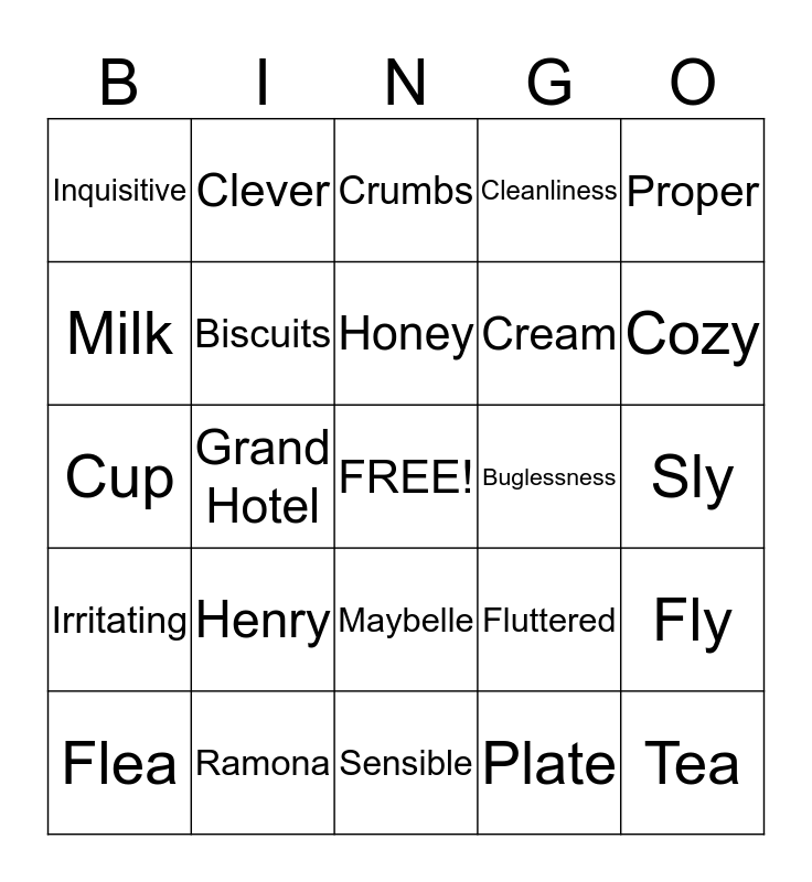 This bingo card has a free space and 44 words: Cake, Tea, Cockroach, Flea, Exterminator, Plate, Crumbs, Fancy, Proper, Ramona, Cleanliness, Buglessness, Maybelle, Henry, Practical, Sensible, Fond, Cup, Saucer, Cozy, Clever, Adventurous, Curious, Inquisitive, Particular, Sly, Enduring, Swatted, Fluttered, Irritating, Maurice, Fly, Mr. Peabody, Mrs. Peabody, Grand Hotel, Flowers, Cookies, Sugar, Honey, Milk, Cream, Scones, Biscuits and Jam.