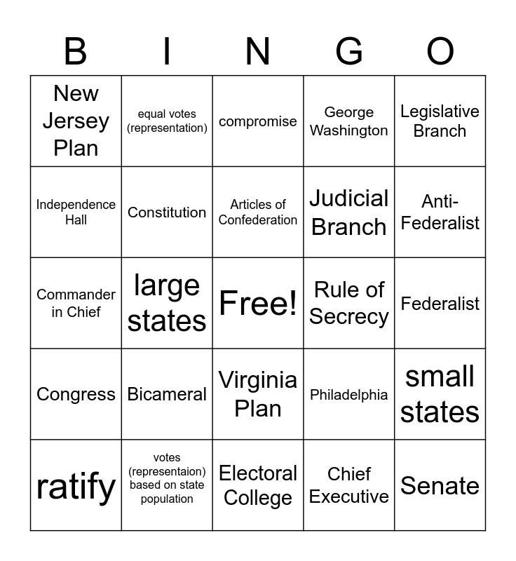 This bingo card has a free space and 27 words: Philadelphia, Shays's Rebellion, Judicial Branch, Electoral College, Independence Hall, compromise, equal votes (representation), Congress, Rule of Secrecy, small states, Commander in Chief, George Washington, ratify, votes (representaion) based on state population, Anti-Federalist, James Madison, Constitution, Articles of Confederation, Bicameral, New Jersey Plan, Federalist, Chief Executive, large states, Senate, Virginia Plan, Legislative Branch and House of Representatives.