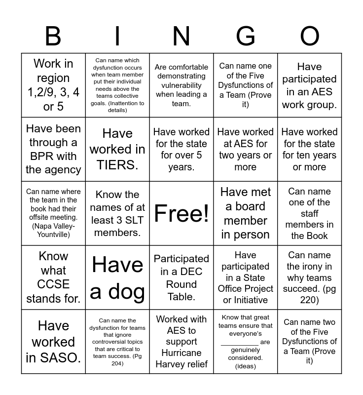 This bingo card has a free space and 39 words: Have been to the LPD Loop site., Know a quester from a previous year., Can recite all of the AES Values (Prove it)., Have worked in TIERS., Have worked in SASO., Participated in a DEC Round Table., Have worked for the state for over 5 years., Have been to 909. W 45th street in Austin., Have participated in an AES work group., Know what CCSE stands for., Know the names of at least 3 SLT members., Can name one of the Five Dysfunctions of a Team (Prove it), Can name two of the Five Dysfunctions of a Team (Prove it), Can name one of the staff members in the Book, Have met a board member in person, Have a dog, Have a cat, Work in region 1,2/9, 3, 4 or 5, Work in region 6, 7, 8, 10 or 11, Have participated in a State Office Project or Initiative, Have been through a BPR with the agency, Worked with AES to support Hurricane Harvey relief, Have worked at AES for two years or more, Have worked for the state for ten years or more, Have met Wayne Salter in person, Have met an SLT member in person, Plan on joining the Alumni Association when I graduate, Can list the “five dysfunctions of a team.” (pg188), Can name which disfunction is caused by a lack of healthy conflict. (lack of commitment), Can name which dysfunction occurs when team member put their individual needs above the teams collective goals. (Inattention to details), Can name five behaviors of a truly cohesive team. (pg189), Can name two behaviors on a team with an absence of trust. (pg 197), Are comfortable demonstrating vulnerability when leading a team., Can name the dysfunction for teams that ignore controversial topics that are critical to team success. (Pg 204), Know that great teams ensure that everyone’s __________ are genuinely considered. (ideas), Know what term refers specifically to the willingness of team members to call their peers on performance or behaviors that might hurt the team. (accountability), Can name the irony in why teams succeed. (pg 220), Can name where the team in the book had their offsite meeting. (Napa Valley- Yountville) and In the book, I know that Kathryn _________ for a living before discovering her affinity for business. (pg10).