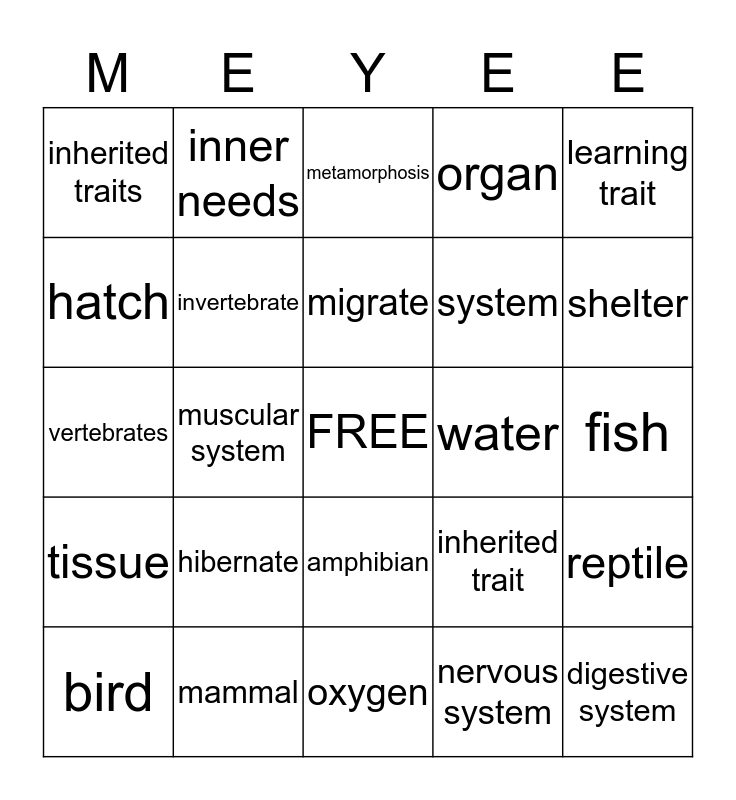 This bingo card has a free space and 24 words: hibernate, mammal, migrate, bird, learning trait, inherited traits, hatch, inner needs, water, amphibian, system, vertebrates, inherited trait, reptile, invertebrate, nervous system, fish, metamorphosis, shelter, muscular system, digestive system, tissue, organ and oxygen.