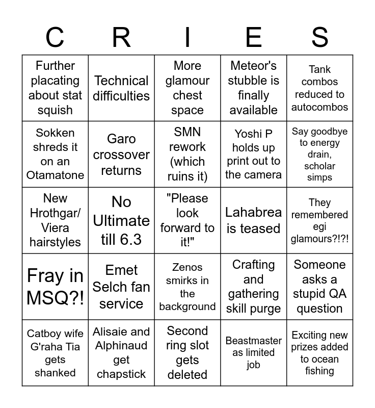 This bingo card has a free space and 24 words: Emet Selch fan service, Alisaie and Alphinaud get chapstick, SMN rework (which ruins it), Catboy wife G'raha Tia gets shanked, Tank combos reduced to autocombos, Further placating about stat squish, Sokken shreds it on an Otamatone, Technical difficulties, Lahabrea is teased, Zenos smirks in the background, Yoshi P holds up print out to the camera, New Hrothgar/ Viera hairstyles, Crafting and gathering skill purge, Someone asks a stupid QA question, Garo crossover returns, Beastmaster as limited job, They remembered egi glamours?!?!, More glamour chest space, Say goodbye to energy drain, scholar simps, No Ultimate till 6.3, Exciting new prizes added to ocean fishing, Fray in MSQ?!, Meteor's stubble is finally available and Second ring slot gets deleted.