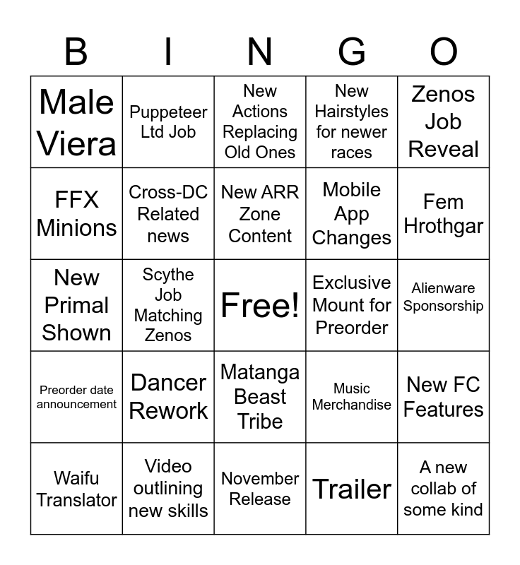 This bingo card has a free space and 24 words: Dancer Rework, Video outlining new skills, New ARR Zone Content, Waifu Translator, Zenos Job Reveal, Male Viera, FFX Minions, Puppeteer Ltd Job, Exclusive Mount for Preorder, Matanga Beast Tribe, Mobile App Changes, New Primal Shown, Music Merchandise, New FC Features, Cross-DC Related news, Trailer, Alienware Sponsorship, New Actions Replacing Old Ones, Fem Hrothgar, Scythe Job Matching Zenos, A new collab of some kind, Preorder date announcement, New Hairstyles for newer races and November Release.