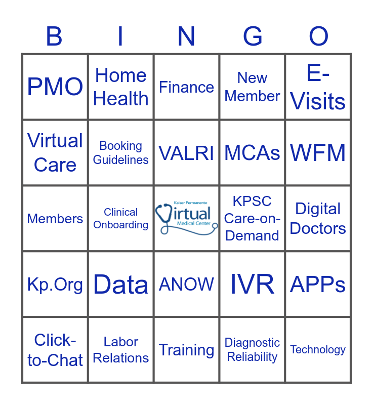 This bingo card has a free space and 36 words: Appointment Booking, Self-Service, Member Experience, Booking Guidelines, IVR, Kp.Org, VALRI, Call Sharing, E-Visits, 24/7, Clinical Onboarding, New Member, KPATHS, KPSC Care-on-Demand, WFM, PMO, Communications, Data, Technology, Finance, Digital Doctors, APPs, Labor Relations, Click-to-Chat, Training, Home Health, Members, Relationship Management, MCAs, Virtual Care, Single Front Door, Care Navigation, Diagnostic Reliability, ANOW, InBasket Support and Teams.
