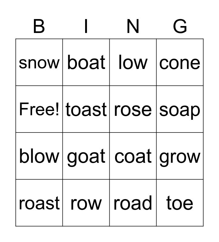 This bingo card has 16 words: row, grow, low, snow, blow, boat, coat, road, Free!, toast, roast, cone, goat, soap, rose and toe.