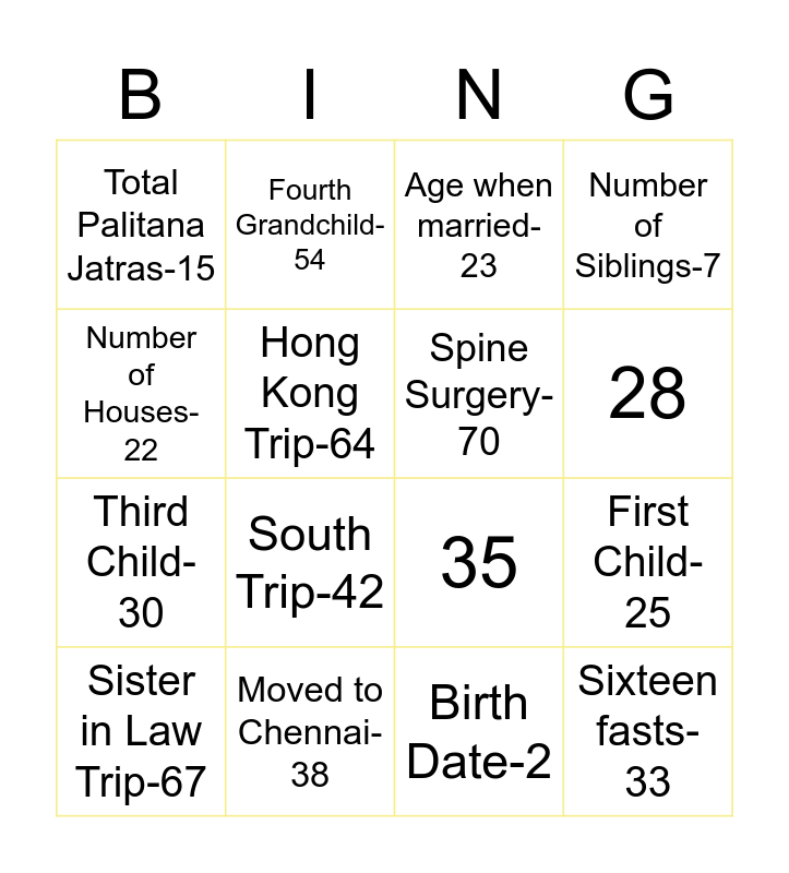 This bingo card has 70 words: Marriage Month-1, Birth Date-2, Number of Children and Brothers-3, Number of Sisters-4, Birth Month-5, Number of Surgeries-6, Number of Siblings-7, Palitana Jatra-8, Number of Houses-22, Number of Marriages she organized-9, Education-10, Number of years in Chennai-14, Total Palitana Jatras-15, Age when married-23, Marriage Date-24, First Child-25, Second Child-27, Third Child-30, Moved to Indore-31, Sixteen fasts-33, Moved to Chennai-38, Mahabaleshwar Trip-40, South Trip-42, Birth Year-46, Mother in Law-47, First Daughter in Law/First Grandchild-48, Second Grandchild-50, First Grandson-51, Second Daughter in Law-52, Abu Trip-53, Fourth Grandchild-54, Mehsana Trip-55, Shikarji Trip-57, Gallbladder Surgery-58, Trip with Sisters-59, Fifth Grandchild-60, Singapore Trip-61, Diksha at Dhakni-62, Kerala Trip-63, Hong Kong Trip-64, Knee Surgery-65, Cataract Surgery-66, Sister in Law Trip-67, Bhutan-68, Year of Marriage-69, Spine Surgery-70, 11, 12, 13, 16, 17, 18, 19, 20, 21, 26, 28, 29, 32, 34, 35, 36, 37, 39, 41, 43, 44, 45, 49 and 56.