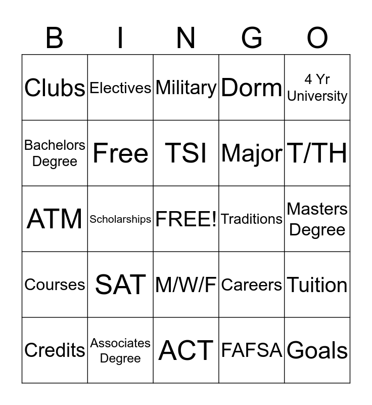 This bingo card has a free space and 25 words: SAT, ACT, TSI, Credits, 4 Yr University, Clubs, Bachelors Degree, Electives, Traditions, M/W/F, Major, ATM, Careers, Tuition, Free, College Sports, Masters Degree, Military, T/TH, Scholarships, Goals, Associates Degree, Courses, Dorm and FAFSA.