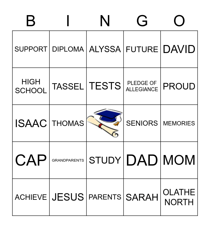 This bingo card has a free space and 49 words: ASHLEY, OLATHE NORTH, EAGLES, PARENTS, GRANDPARENTS, GRADUATE, DIPLOMA, COLLEGE, HIGH SCHOOL, FRIENDS, TASSEL, FUTURE, MOM, DAD, REMEMBER, GRADES, TESTS, SENIORS, CLASS OF 2021, DAVID, THOMAS, SARAH, SUPPORT, PLEDGE OF ALLEGIANCE, LEVI, PROUD, ACHIEVE, BOOKS, STUDY, CAP, ESTEEMED, SYDNEY, ANNA, JOSE, JESUS, MARY, CELEBRATE, DREAMS, MEMORIES, STOMP CLAP, PRINCIPAL, ADAM, KYLIE, OLIVIA, ISAAC, ALYSSA, MASON, ALISON and AUSTIN.