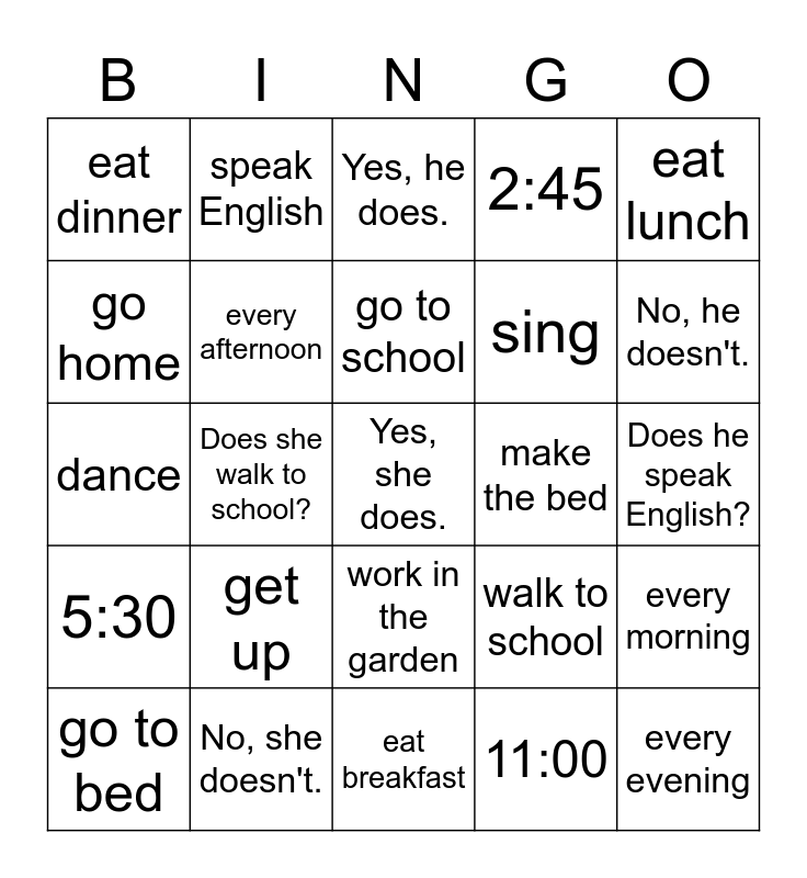 This bingo card has 25 words: get up, eat breakfast, go to school, go to bed, eat lunch, eat dinner, go home, speak English, make the bed, work in the garden, sing, dance, walk to school, every morning, every afternoon, every evening, Does he speak English?, Yes, he does., No, he doesn't., Does she walk to school?, Yes, she does., No, she doesn't., 5:30, 2:45 and 11:00.