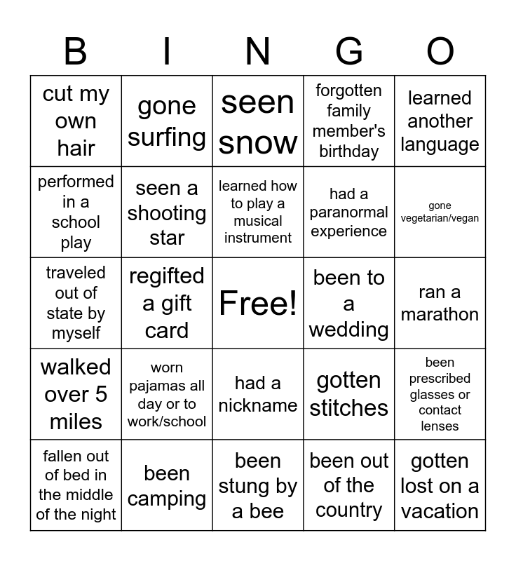 This bingo card has a free space and 24 words: worn pajamas all day or to work/school, been camping, learned how to play a musical instrument, fallen out of bed in the middle of the night, learned another language, cut my own hair, performed in a school play, gone surfing, been to a wedding, had a nickname, had a paranormal experience, traveled out of state by myself, gotten stitches, been prescribed glasses or contact lenses, seen a shooting star, been out of the country, ran a marathon, seen snow, gone vegetarian/vegan, regifted a gift card, gotten lost on a vacation, walked over 5 miles, forgotten family member's birthday and been stung by a bee.