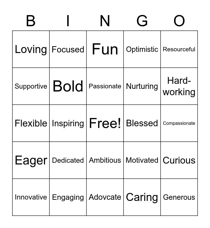 This bingo card has a free space and 24 words: Innovative, Dedicated, Passionate, Caring, Resourceful, Loving, Focused, Fun, Blessed, Compassionate, Flexible, Bold, Motivated, Curious, Supportive, Engaging, Adovcate, Optimistic, Hard-working, Eager, Inspiring, Ambitious, Nurturing and Generous.