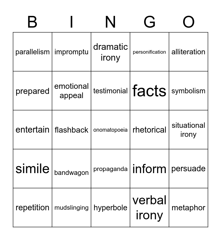 This bingo card has a free space and 24 words: bandwagon, mudslinging, testimonial, repetition, alliteration, parallelism, prepared, impromptu, rhetorical, propaganda, facts, entertain, inform, persuade, emotional appeal, verbal irony, situational irony, dramatic irony, symbolism, flashback, metaphor, simile, personification and hyperbole.