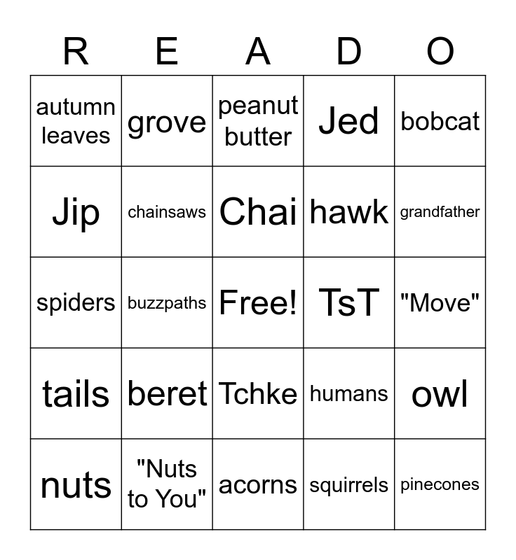 This bingo card has a free space and 24 words: beret, "Nuts to You", Chai, nuts, bobcat, autumn leaves, Jip, grove, TsT, Tchke, hawk, spiders, humans, owl, chainsaws, squirrels, "Move", peanut butter, grandfather, buzzpaths, pinecones, tails, Jed and acorns.