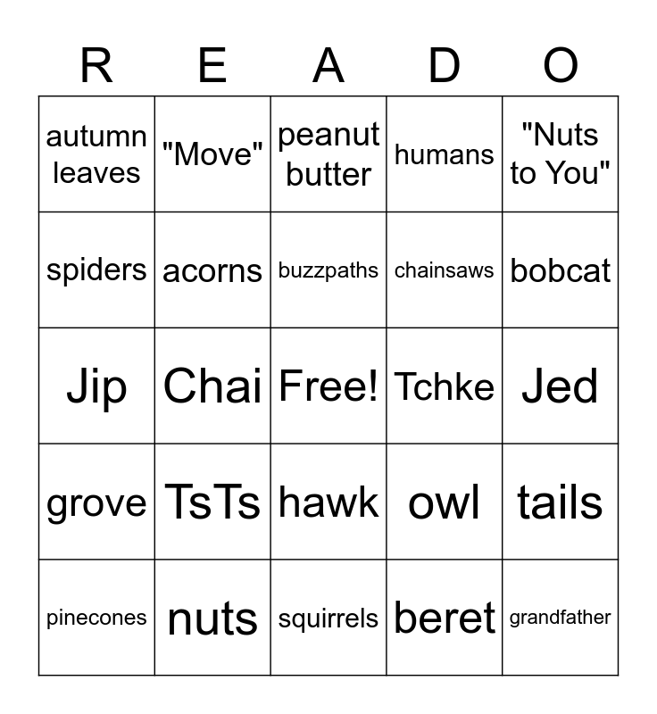 This bingo card has a free space and 24 words: TsTs, nuts, buzzpaths, pinecones, "Nuts to You", autumn leaves, spiders, "Move", Tchke, hawk, chainsaws, Jip, owl, tails, acorns, beret, Jed, peanut butter, bobcat, Chai, grandfather, grove, humans and squirrels.