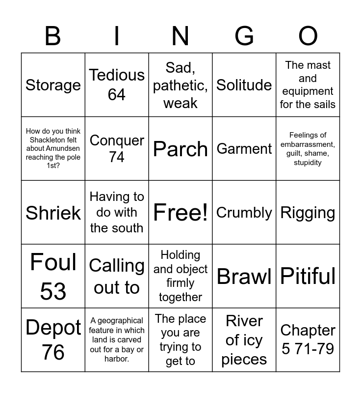 This bingo card has a free space and 153 words: Vocabulary Word, Definition, Brawl, A fight, Continent, IE: Europe, Expedition, A trip, Forbidding, Daunting, dangerous, threatening, Frigid, Very cold, Garment, Clothing, Rigging, The mast and equipment for the sails, Solitude, Alone and in peace, Square- rigger, A type of sailboat, Vivid, Clear, crisp ( visual/Image), Chapter 2: 53-58, Flank 53, The side, on the side, Floe 53, River of icy pieces, Foul 53, Bad smelling, Frontier 52, Unexplored or little known place, Gale 56, Extreme wind, Glacial 54, Something to do with a glacier, Outcropping 57, A group, an outlier, Plague 57, A disease;, Plume 53, A big cloud, Shaly ( shale) 53, Crumbly, Chapter 3 58-64, Barren 63, Empty, “fruitless”, Complexion, Has to do with your skin, usually in relation to your face, Exotic, Unusual; unique, Humiliation, Feelings of embarrassment, guilt, shame, stupidity, Investment, Putting in money/time/effort to something, Journalism, The field of written reporting, Parliament 64, The British form of legislative government, Routine, Repetitive activities or structure/schedule, Tedious 64, Boring, repetitive, time consuming, Whiteout, Snowing hard enough to cause “blindness”/ reduces visibility, Chapter 4 64-71, Beckon 71, Calling out to, Conscience 67, Your inner mind, Crevasse 70, Cracks in the snow/ice, Inlet 66, A geographical feature in which land is carved out for a bay or harbor., Reluctantly 66, Not motivated to do it; hesitant; unwilling, Stupendous 70, Super; great; excellent, Treacherous 70, Dangerous; difficult, Vast 70, Large, expansive, Chapter 5 71-79, Austral 76, Having to do with the south, Conquer 74, To accomplish/overtake something, Current 79, A flow of a substance, Depot 76, Storage, Destination 76, The place you are trying to get to, Endurance 74, To be able to withstand obstacles or difficulties, Gash 79, Hole, sliver, cut, Knight 72, A strong brave person who is getting awarded for their accomplishment, Literal/explicit/thin, What was Shackleton’s goal for his 3rd expedition?, Inferential/ thick, How do you think Shackleton felt about Amundsen reaching the pole 1st?, Chapter 6 80-86, Base 85, Headquarters, Disintegrate 86, Break down, dissolve, Hoist 81, Pick/pull/move up, Impersonate 80, Copying someone, Pitiful 83, Sad, pathetic, weak, Seam 81, Where two materials come together, Unscathed 86, Not getting injured or hurt; avoiding danger, Vise 81, Holding and object firmly together, Chapter 7 86-96, Conceive, Hurl, Labor, Parch, Uninhabited, Ordeal, Sheer, Shriek, Straggle, Forbidding, Solitude, Vivid, Floe, Tedious, Beckon, Treacherous, Vast, Endurance, Pitiful, Unscathed, Uninhabited, Conceive, Ireland, England, Antarctica, South Pole, Scotland, Shackleton, Scott, Discovery, Base, Inlet and Scurvy.