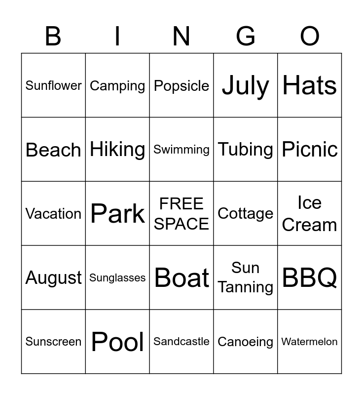 This bingo card has a free space and 24 words: Sunglasses, Pool, Swimming, Sunscreen, Hats, Sunflower, Beach, Camping, Cottage, Boat, Tubing, Vacation, Sun Tanning, BBQ, Hiking, Canoeing, Ice Cream, Popsicle, Picnic, Park, Watermelon, August, July and Sandcastle.