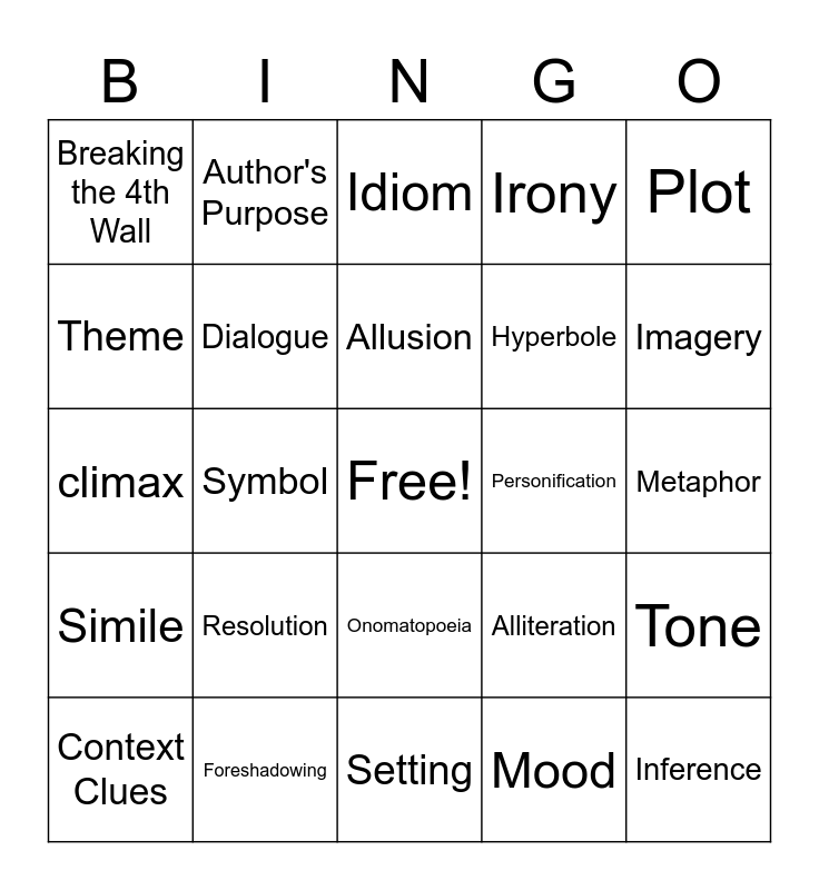 This bingo card has a free space and 24 words: Resolution, Foreshadowing, Allusion, Context Clues, Plot, Breaking the 4th Wall, Theme, Author's Purpose, Personification, Onomatopoeia, Hyperbole, climax, Alliteration, Tone, Dialogue, Mood, Metaphor, Idiom, Imagery, Symbol, Inference, Simile, Irony and Setting.