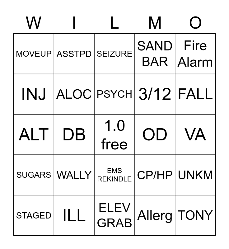 This bingo card has a free space and 33 words: BILL Squire, CODE, DB, CAHCAH, SUGARS, ALOC, Fire Alarm, STAGED, ASSTPD, DOUBLE BUBBLE, PSYCH, SEIZURE, MVA, ABD, OD, FALL, ILL, ALT, WALLY, CP/HP, EMS REKINDLE, COSTCO, MOVEUP, VA, ELEV GRAB, TONY, SAND BAR, 3/12, INJ, UNKM, ASSLT, Allerg and UNC.