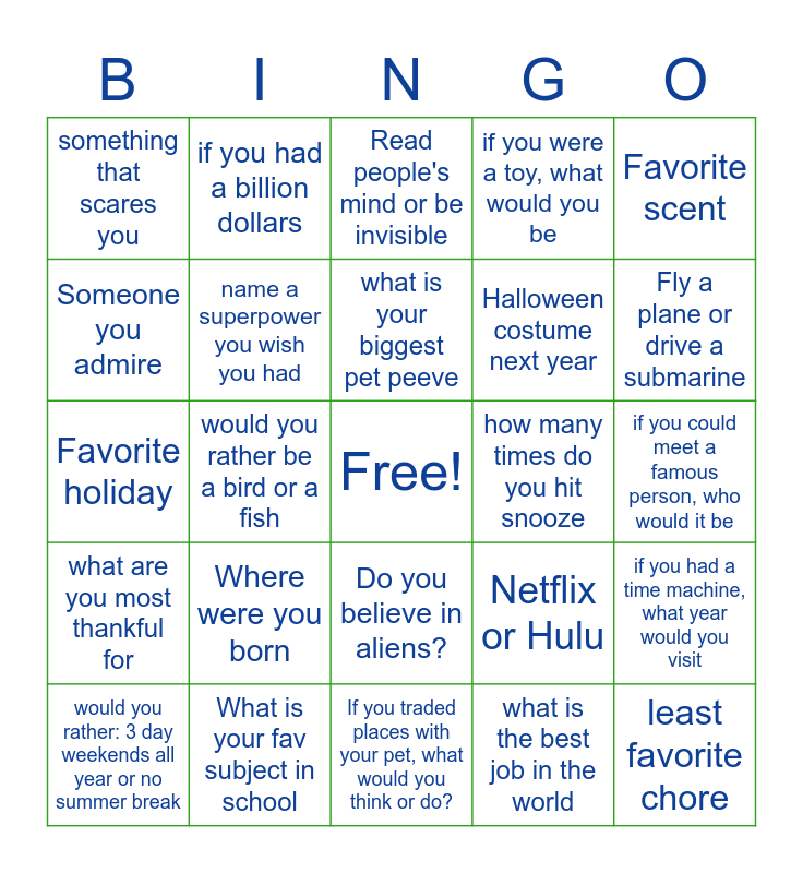 This bingo card has a free space and 24 words: Where were you born, What is your fav subject in school, what is your biggest pet peeve, would you rather: 3 day weekends all year or no summer break, Favorite scent, something that scares you, Someone you admire, if you had a billion dollars, how many times do you hit snooze, Do you believe in aliens?, Halloween costume next year, Favorite holiday, Netflix or Hulu, if you had a time machine, what year would you visit, name a superpower you wish you had, what is the best job in the world, if you could meet a famous person, who would it be, Read people's mind or be invisible, Fly a plane or drive a submarine, would you rather be a bird or a fish, least favorite chore, what are you most thankful for, if you were a toy, what would you be and If you traded places with your pet, what would you think or do?.